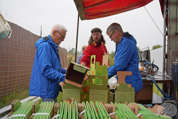 Till Kramer aus Reddighausen mit seinem Saftmobil hat wieder in professioneller Art und Weise die von den Besuchern mitgebrachte Apfelernte gewaschen, geschreddert, gepresst, abgekocht und lagerfertig in Beutel und Kisten verpackt. Zum Apfelsaftpressen mit eigenen Äpfeln musste man sich beim Saftmobil vorher anmelden und so waren die Termine gut koordiniert und so getaktet, dass keiner lange auf seine Ware warten musste und die Ernte zügig verarbeitet werden konnte. Den Produktionsprozess vom Apfel bis hin zum fertigen Saft konnten die Besucher live miterleben. Die Äpfel werden aufs Förderband sortiert, gewaschen, geschreddert und anschließend gepresst. Der eigens auf dem Mobil befindliche Kocher erhitzt den Saft auf 78 Grad und macht ihn nach dem Abfüllen in luftdicht verschlossene Beutel mehrere Jahre haltbar. Als Faustregel gilt: aus 50 kg Äpfel werden rund 35 Liter Saft