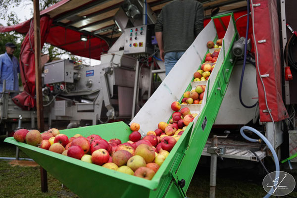 Äpfel werden aufs Förderband sortiert, gewaschen, geschreddert und anschließend gepresst. Der eigens auf dem Mobil befindliche Kocher erhitzt den Saft auf 78 Grad und macht ihn nach dem Abfüllen