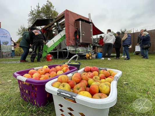 lagerfertig in Beutel und Kisten verpackt. Zum Apfelsaftpressen mit eigenen Äpfeln musste man sich beim Saftmobil vorher anmelden und so waren die Termine gut koordiniert und so getaktet, dass