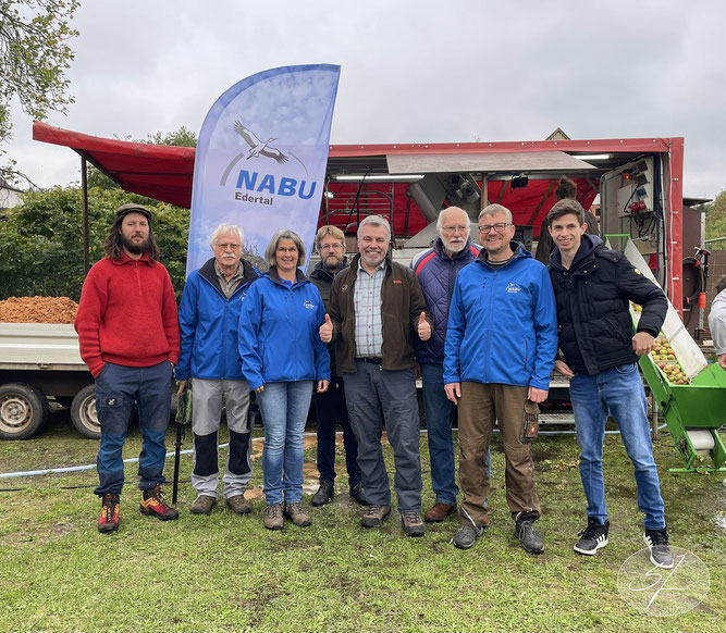 Foto (privat NABU), von links vor dem Saftmobil: Till Kramer (Das Saftmobil), Heinrich Schween (NABU), Simone Jungermann (NABU), Mathias Michel (Pomologe), Jörg Roth (Imker, Sielmanns Naturranger), Wolfgang Fröhlich (Pomologe), Markus Jungermann (1. Vors. NABU Gruppe Edertal), Marvin Roth (Sielmanns Naturranger)